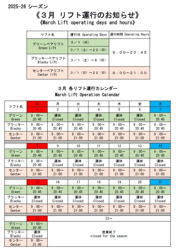 ※積雪など、その他の状況により変更する場合がございますので、あらかじめご了承ください。