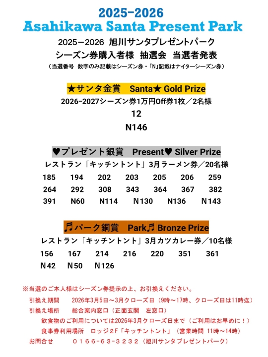 「旭川サンタプレゼントパーク2025-2026シーズン券 ご当選者発表」